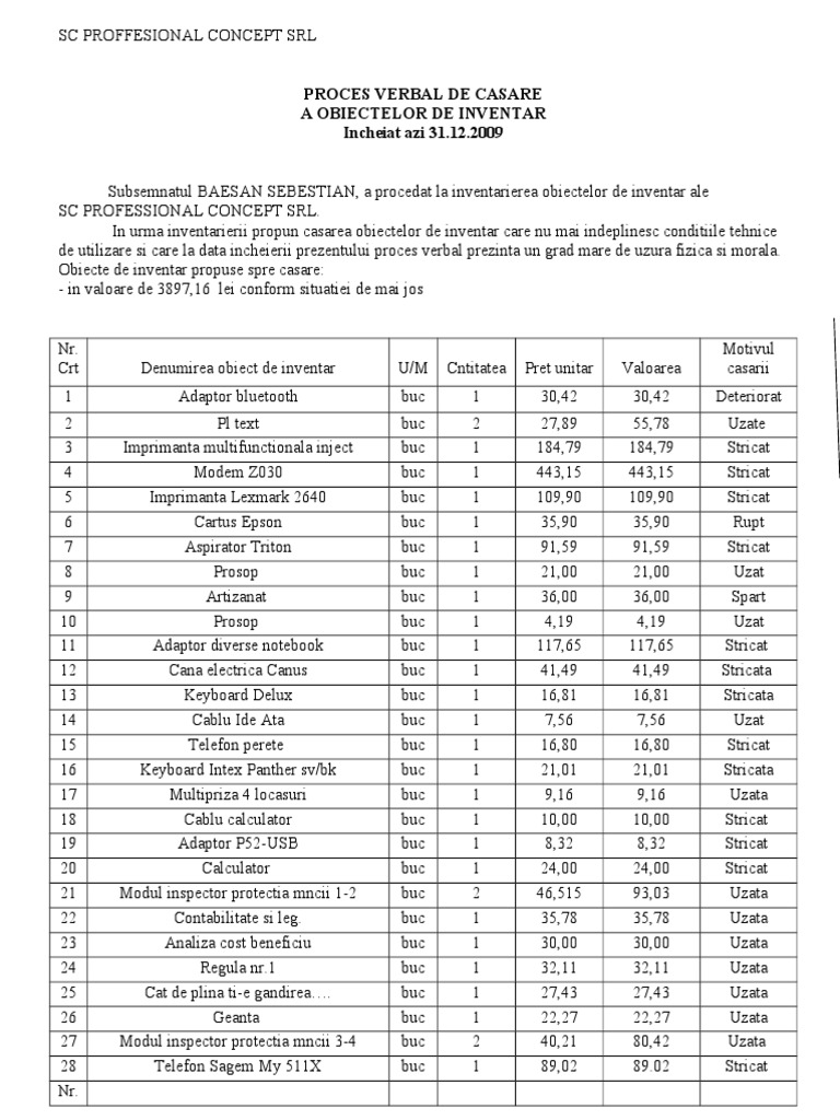 Proces Verbal De Casare Obiecte De Inventar Model Word. Download formular model de proces verbal de receptie in format pdf, word, doc,. Vezi si decizie inventar >>. Casarea elementelor de natura obiectelor de inventar se va face în baza unui proces verbal de predare primire între societatea supusa inventarierii în raport cu o societate specializată/autorizată în colectare de deșeuri de natura celor în cauză. Cuprinsul manualului de proceduri de inventariere In doua exemplare, separat pentru mijloace fixe, materiale de natura obiectelor de inventar in folosinta si bunuri materiale aflate in gestiunea unui singur gestionar, pe baza documentatiei prevazute in.
