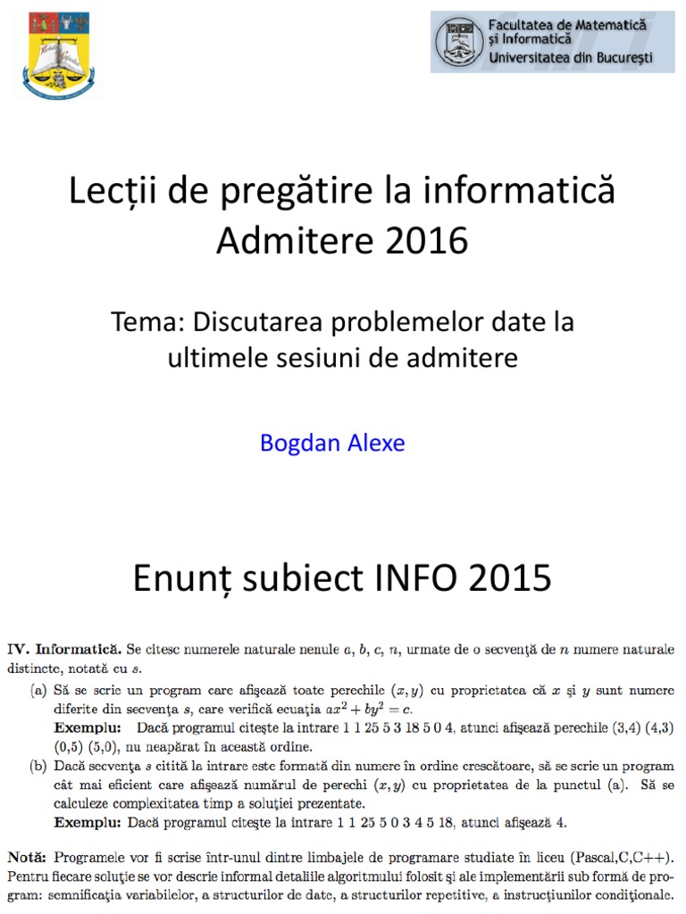 Succes tuturor la concursul de admitere de anul acesta! As dori niste pareri aspura facultatii de informatica din bucuresti, merita aleasa? Aveți mai jos subiectele și baremele de corectare (la disciplinele matematică și informatică) date la admitere la facultatea de matematică și informatică , universitatea bucurești în ultimii ani: