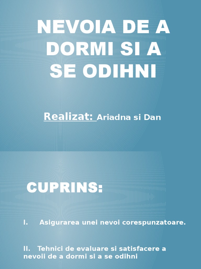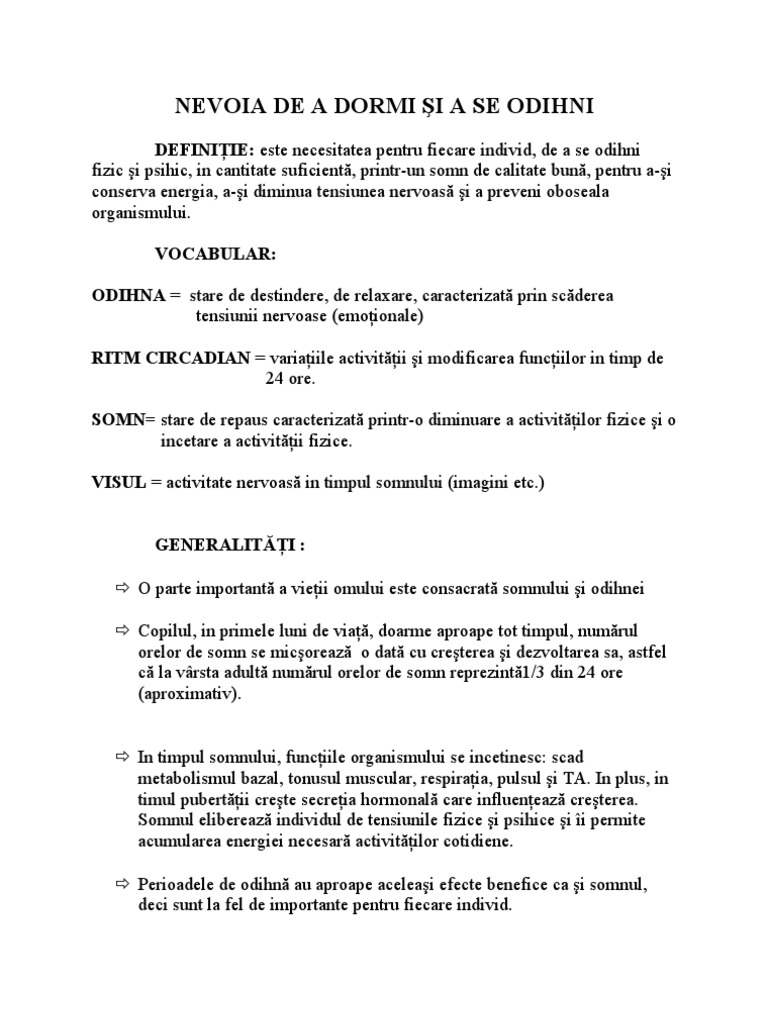 Diagnosticul de îngrijire este un enunţ concis actual sau potenţţial, al manifestărilor de dependenţă al persoanei, regrupate sau nu şi legate de o sursă de dificultate ( repertoire des diagnosties infirmiers, riopelle, grondin, phaneuf). Nevoia de dormi şi de a se odihni. Din punct de vedere biologic si fiziologic, somnul sau odihna variaza cu varsta si starea de sanatate.